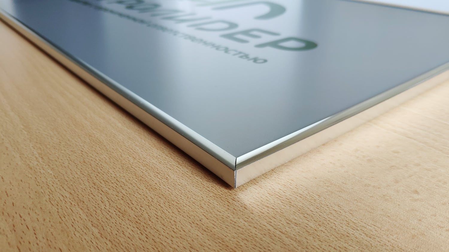 Для проекта были изготовлены таблички из серебристого алюминиевого композита толщиной 3 мм. На поверхность методом прямой УФ-печати нанесён логотип и название компании в фирменных цветах. Такая технология позволила добиться яркости и чёткости изображения, сохранив его стойкость к выцветанию и истиранию.