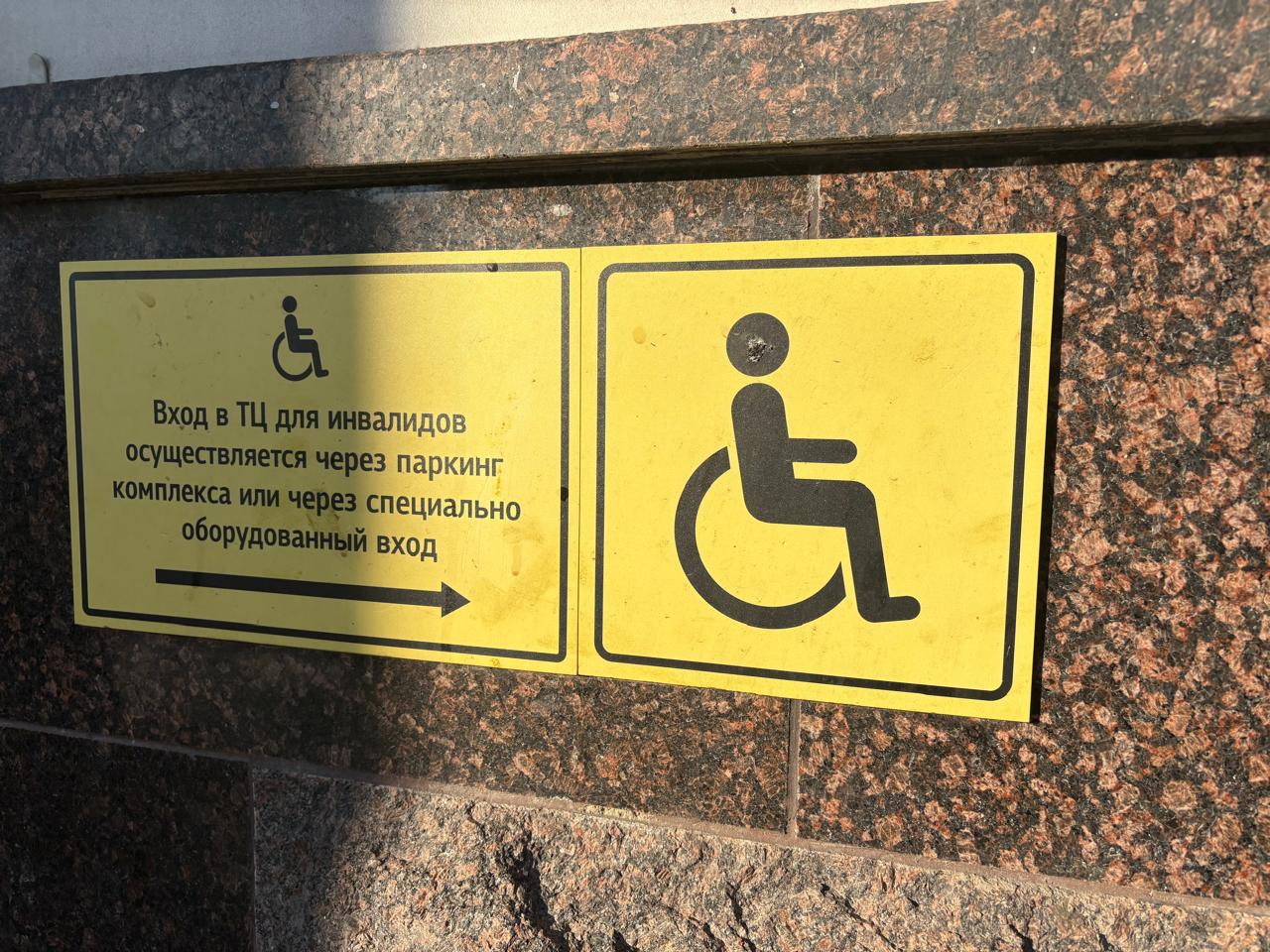 Для проекта были изготовлены прямоугольная и квадратная таблички из алюминиевого композита толщиной 3 мм в жёлтом цвете. На поверхность методом прямой УФ-печати нанесены чёрные надписи и графические элементы — указатели для обозначения входа для людей с ограниченными возможностями. Таблички соединены между собой в единый блок, что сделало конструкцию компактной и удобной для восприятия.